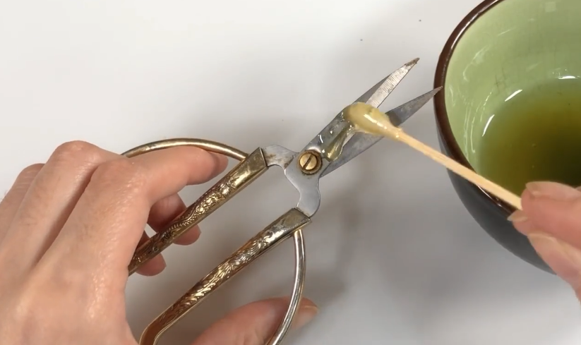 几分钟后再把油擦掉,费油相当于平时我们使用的机油,所以涂抹剪刀上或者是其他类似材质的工具上面,就可以起到一个很好的保养效果,剪刀也就不会钝了。