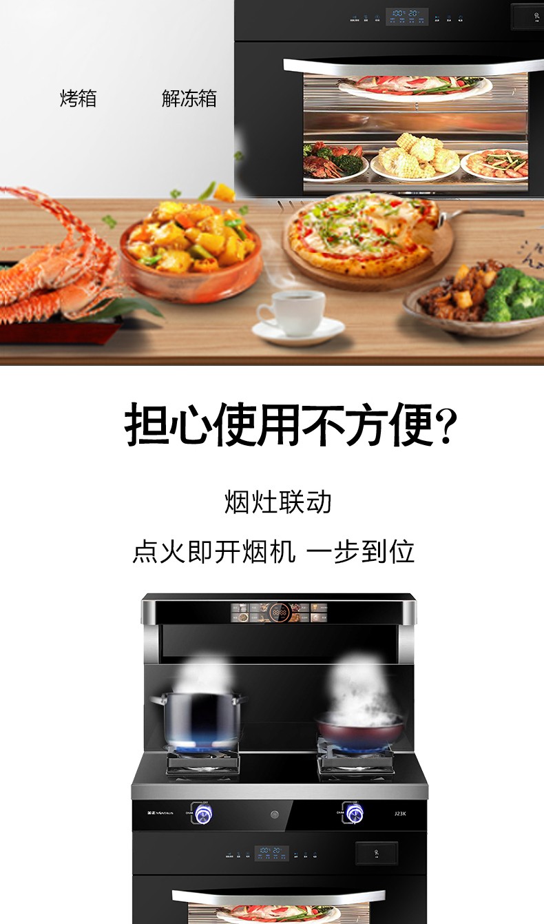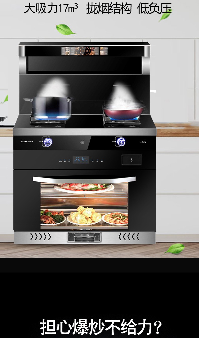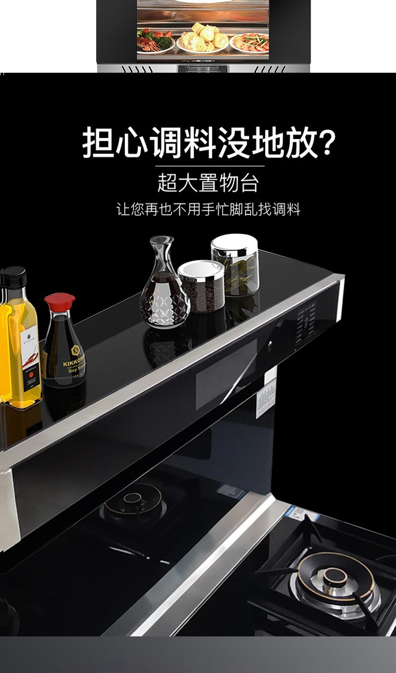 钢化玻璃面板/无螺钉拉篮工艺;蒸烤消一体机/烟灶灯联动;280超大风轮/炫彩旋钮灯/声控小智体感;头部恒温暖菜宝/热除油清洗;内置防火墙/漏气安防装置。
