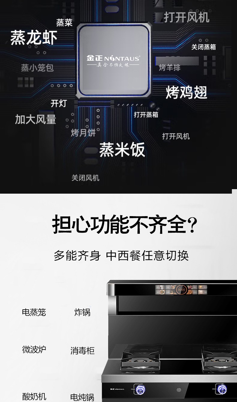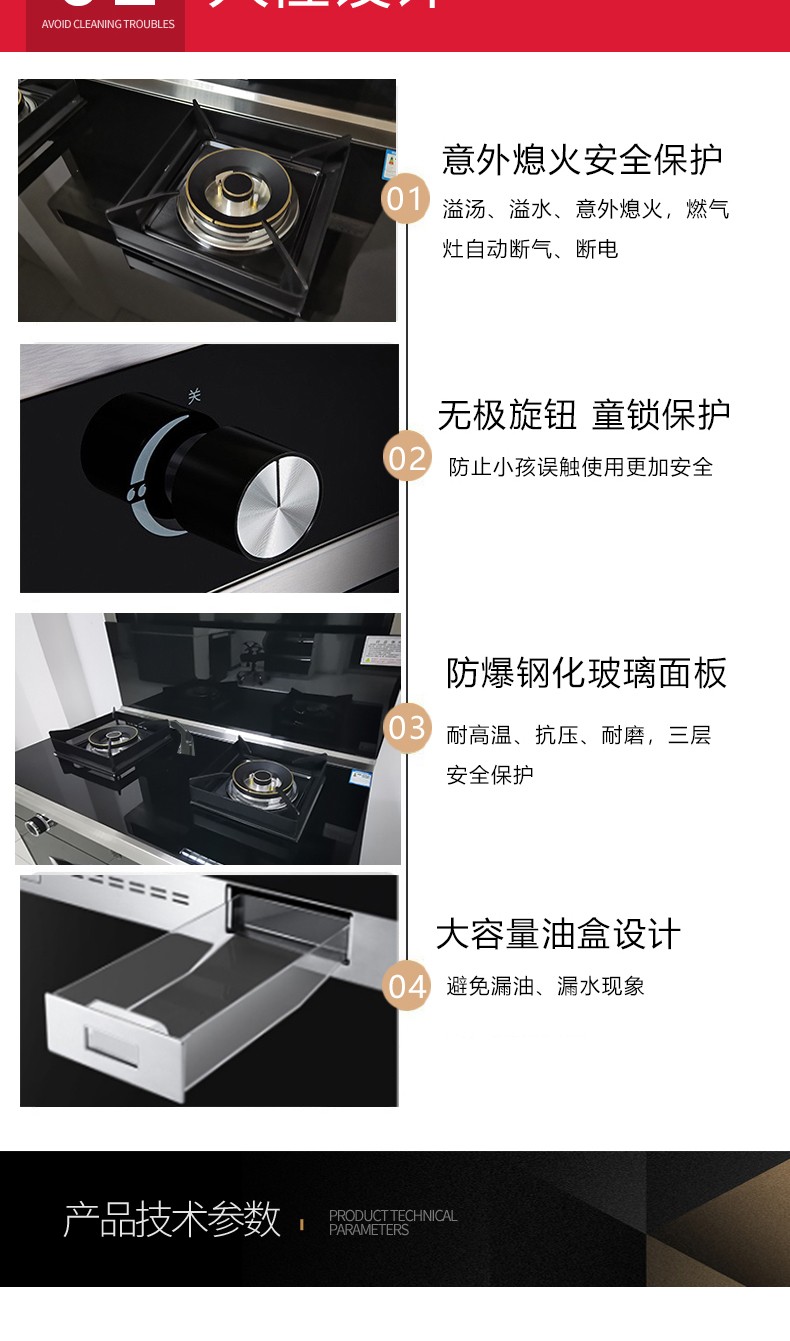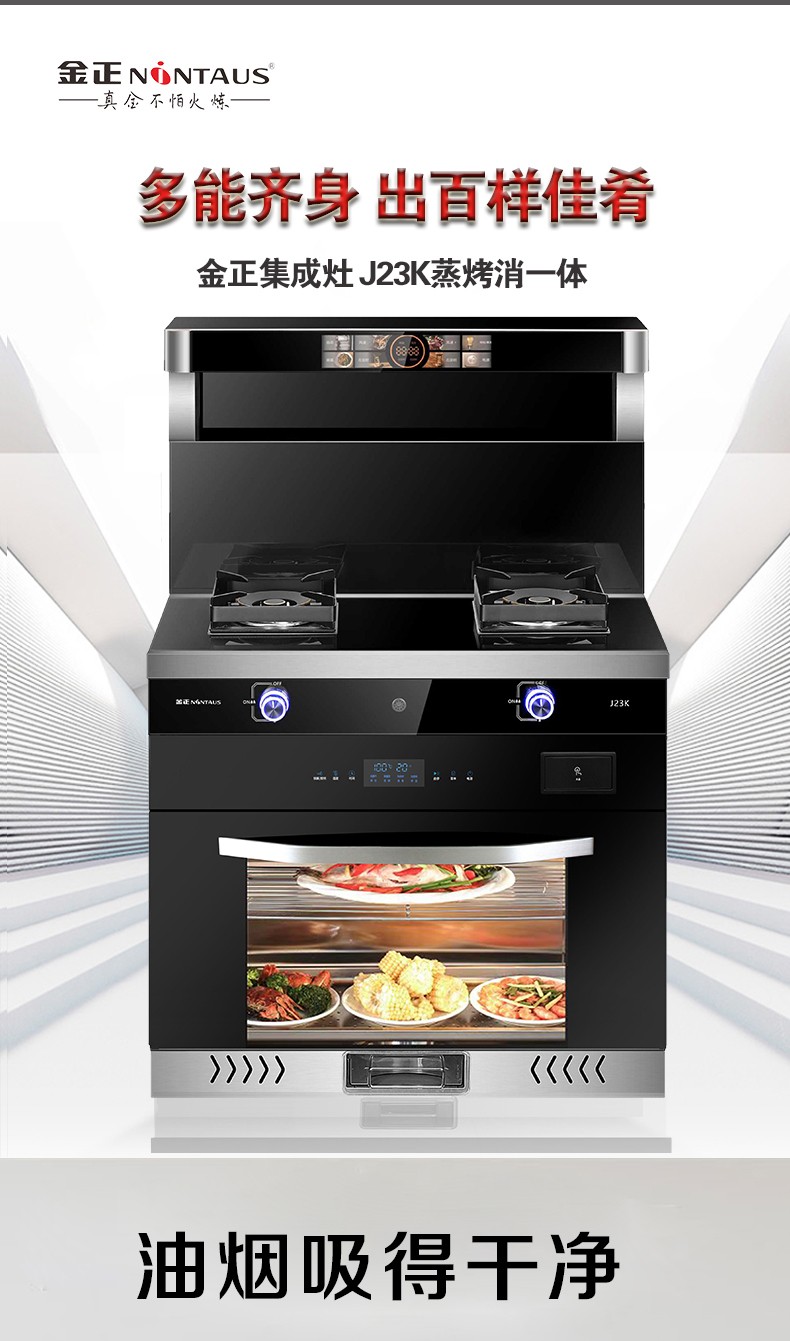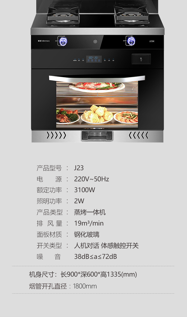 钢化玻璃面板/无螺钉拉篮工艺;蒸烤消一体机/烟灶灯联动;280超大风轮/炫彩旋钮灯/声控小智体感;头部恒温暖菜宝/热除油清洗;内置防火墙/漏气安防装置。