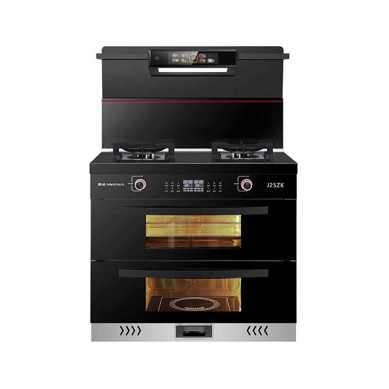 磨砂钢化玻璃面板/上蒸下烤;声控小智体感/烟灶灯联动;280超大风轮/彩灯旋钮/内置防火墙;头部恒温暖菜宝/热除油清洗;零秒点火/灶具定时/漏气安防装置。
